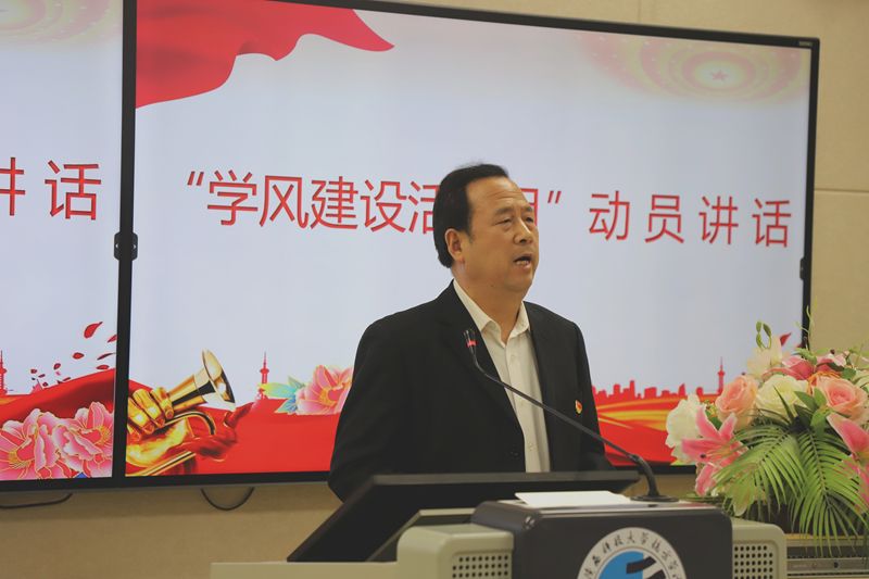 李宗领做动员讲话,李校长指出,本次学风建设活动月以“学会做人、学会学习、学会做事、学会生活”为核心,是对学校“立德树人”根本任务的深化落实,更是应对转设挑战、迎接教学评估与专业认证的关键举措。李校长深刻阐述学风建设的紧迫性,提出“三个不转不行”,强调学风是学校的精神底色与高质量发展底气。他要求通过持续五周、覆盖全体的“四学会”行动,激发基层活力,筑牢育人根基。针对“四学会”落地,李校长为各年级做出明确规划,大一“扎根”、大二“亮剑”、大三“担当”、大四“落实”;并对教师提出“四大角色”定位:思政教师引领职业操守、专业教师赋能学习能力、辅导员守护生活习惯、督导专家把关教学质量。提出“四个一”学生行动与学校“三拳”机制,设定了包括“四学会”认知度超90%、学习习惯改善率超70%、课程及格率提升5%—8%等阶段性目标,致力营造“比学赶超”氛围。最后,他号召全体师生以“四学会”为纲领,将动员会作为冲锋号角,携手书写学校高质量发展新篇章。