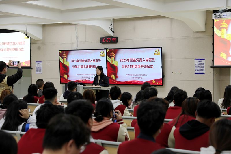 为全面贯彻新时代党的建设总要求,筑牢党员发展质量防线,巩固党组织后备队伍建设,抓实对学生的思想政治教育工作。10月21日下午,我校2025年预备党员入党宣誓暨第41期党课开班仪式在教学楼201报告厅隆重举行。