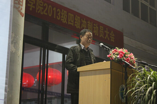 在距离2014年12月20日四级考试还剩一个月之际,我院于2014年11月21日晚在教学楼前广场召开2013级四级冲刺动员大会,出席大会的主要领导有陕西科技大学镐京学院院长贾争现老师,党总支书记张卫平老师,副院长南社社老师,副院长郭国法老师。学生处、教务处、外语部和各二级学院主要负责人也出席了会议,会议由外语部主任黄锦桥老师主持。