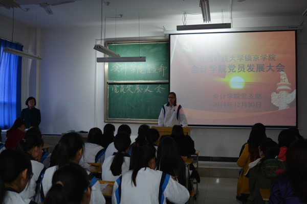 2014年12月30日下午16:10,陕西科技大学镐京学院会计学院党支部党员发展大会在科技楼206教室庄严的拉开帷幕。列席会议的领导有会计学院党支部书记、副院长包艳老师,会计学院副院长赵卓老师、会计学院党支部副书记王颖老师,大会由包艳老师主持。