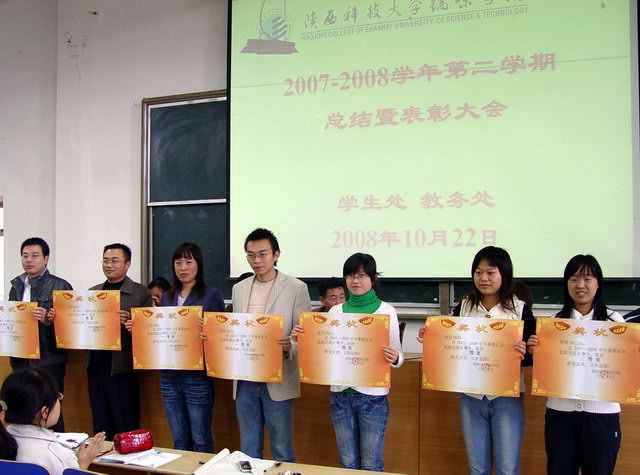 10月22日下午,镐京学院06级、07级学生在4号学术报告厅分别举行2007至2008学年第二学期总结暨表彰大会。表彰了在过去一个学期的学习、社会实践和工作生活中取得优异成绩和突出进步的“优秀学生、三好学生、突出进步学生、优秀学生干部、社会实践先进个人及优秀班级”,并对优秀的班集体和个人颁发了奖状和证书。镐京学院副院长俞从正,人财办主任南社社等学院和系部领导出席了大会。