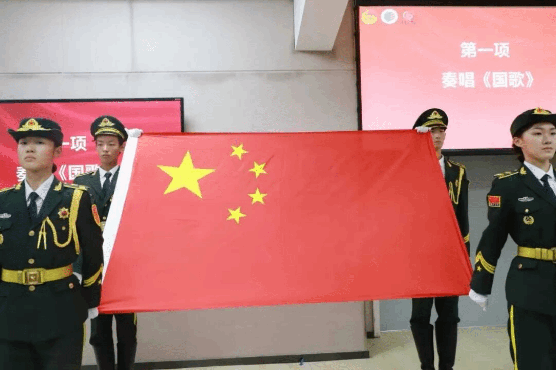 国歌响彻会场,国旗护卫队迈着整齐的步伐入场,护送着熠熠生辉的五星红旗,全体师生肃立致敬。