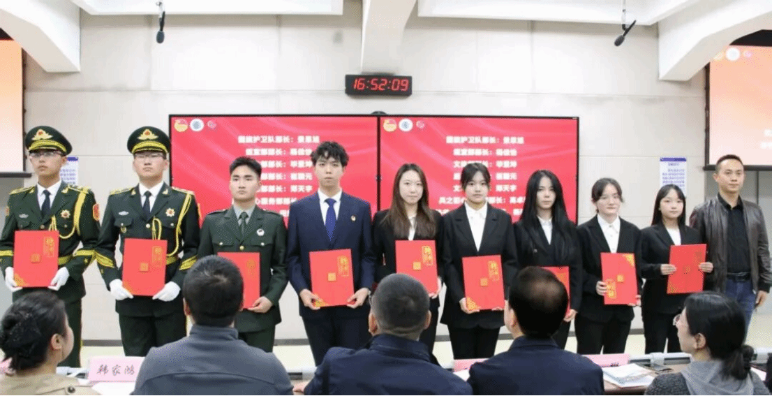 国旗护卫队进行了庄严的交接仪式。队旗、指挥刀、礼宾枪、95式自动步枪在新老队员间郑重传递。每一次传递,都是“护我国旗”神圣责任的薪火相传,是滚烫信仰的再次点燃。这支光荣的队伍,必将不负重托,让五星红旗在镐京学院永远高高飘扬!