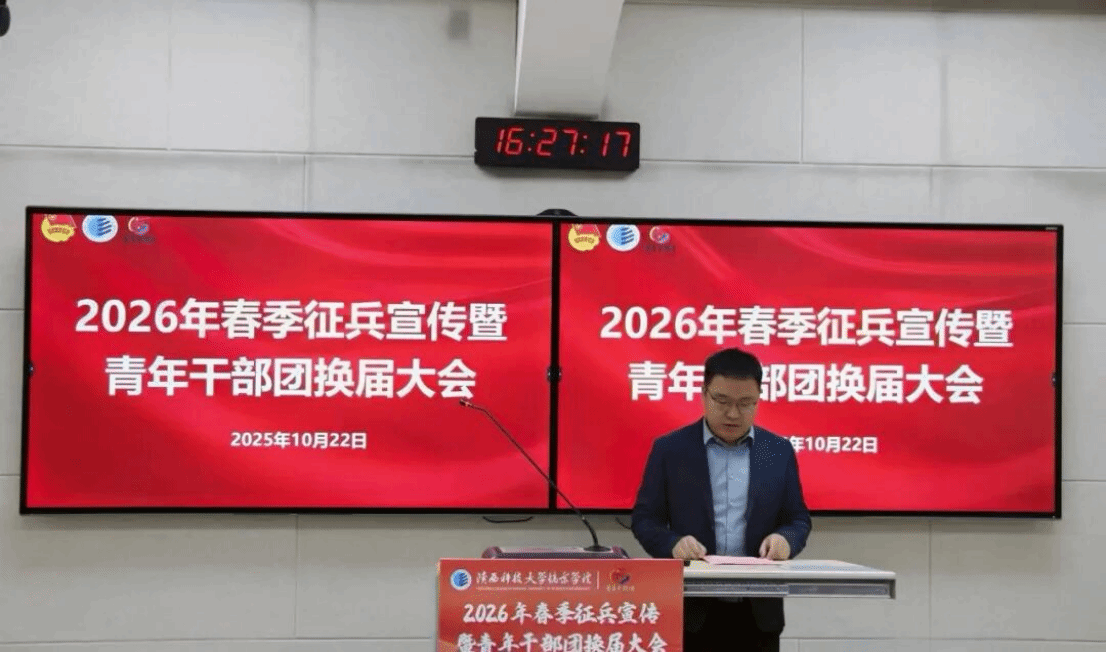 2025年10月22日下午,我校2026年春季征兵宣传暨青年干部团换届大会在教学楼223报告厅隆重举行。党委书记王贵平,校长助理、学生处处长吕超,党委工作部,党委宣传部,校团委,科技处负责人出席大会,各校级组织学生代表、青年干部团全体成员参加大会。本次大会由学生处副处长唐鹏程主持。