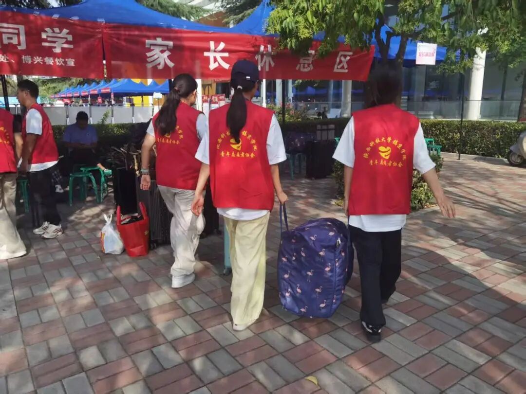 在校园道路的每一个拐角处、每一个分岔路口,志愿者们顶着烈日耐心为新生指引路线、搬运行李,一句“学弟学妹这边走”传递着最贴心的关怀。从校门到宿舍,从报到点到食堂,他们用热情与微笑化解新生初来乍到的无措。感谢每一位志愿者的付出,让入学第一天充满归属感!