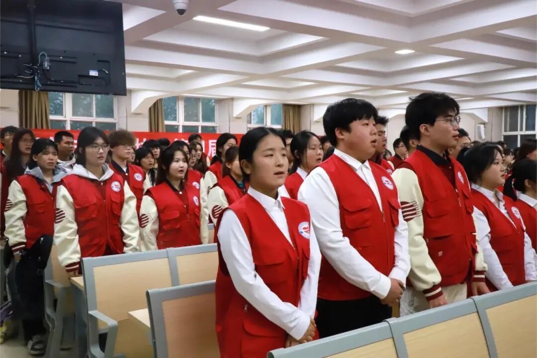 第五届青年志愿者协会执行主席柏朝阳作就职报告。他表示将以更高的热情和更严谨的态度投入到工作中。未来,青协将集思广益,不断加强队伍建设,通过定期组织培训、交流活动等方式,提升成员的整体素质。同时,计划增强成员对协会的集体荣誉感,努力把青协打造成为一个极具凝聚力的优秀集体。新一届学生干部将持续弘扬"奉献、友爱、互助、进步"的志愿服务精神,为校园和社会贡献更多的青春力量。最后,柏朝阳带领全体青年志愿者宣誓。