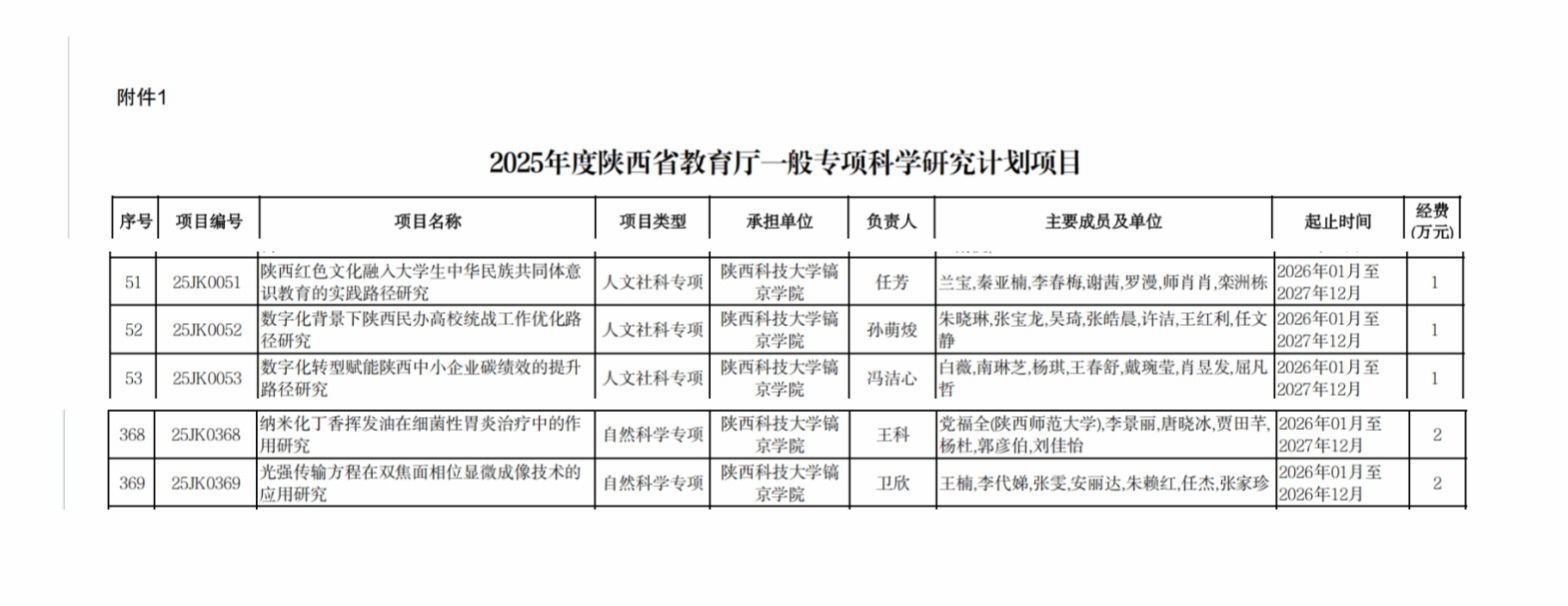 近日,陕西省教育厅正式下发《2025年度科学研究计划项目通知》(陕教函〔2025〕1131号)文件,公布了2025年度科学研究计划项目立项名单,我校共有6个项目获批,其中一般专项科学研究计划项目5项、服务地方专项科学研究计划项目(教育管理专项项目)1项。